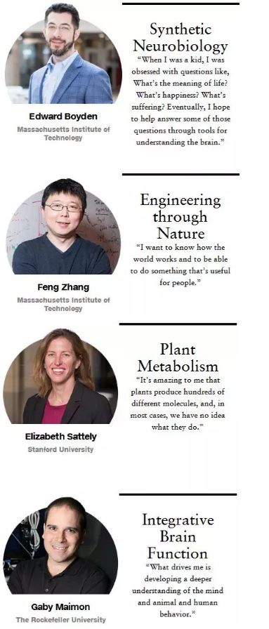 1982年出生于河北石家庄的张锋前不久还先后当选为美国艺术与科学院院士和美国国家科学院院士,这次又拿到HHMI可谓梅开三度。张锋博士可谓当今世界科学领域最受关注的华人科学家,也被视为角逐诺贝尔奖的热门人选之一(尽管很多人不看好他在基因编辑上会拿奖,但是他在高度灵敏的核酸检测工具方向上的重大贡献也非常有前景)。张锋于2004年获得哈佛大学化学与物理学学士学位(本科期间在庄小威实验室学习),2009年获得斯坦福大学化学及生物工程博士学位(导师是光遗传学领域的“执牛耳” Karl Deisseroth,博士期间,张锋和Edward Boyden一道发展了光遗传学技术,论文发表在Nature Neuroscience和Nature Methods杂志上,好玩的是它俩如今还一同入选HHMI研究员),2011年加入MIT和Broad Institute,2014年被《自然》杂志评选为2013年年度十大科学人物之一,2016年拿到MIT终身教职,2016年3月获得加拿大盖尔德纳国际奖,2016年9月入围汤森路透化学领域“引文桂冠奖”,2017年8月获得阿尔伯尼生物医学奖(历史上第二名获得此奖项的华人学者,第一位是哈佛大学谢晓亮教授,他于2015年获得此奖),2018年成为美国艺术与科学院院士和美国科学院院士。作为基因编辑领域的先锋人物,张锋博士还创立了基因编辑领域的著名公司 Editas Medicine。