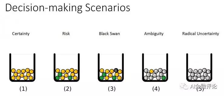 第四层是 Ambiguity 模糊性。“明天的股市不是涨就是跌,但是涨跌的比重没人知道。即便我们有过去世界所有股市的数据,但仍不知道明天是涨还是跌,因为有太多影响因素。”