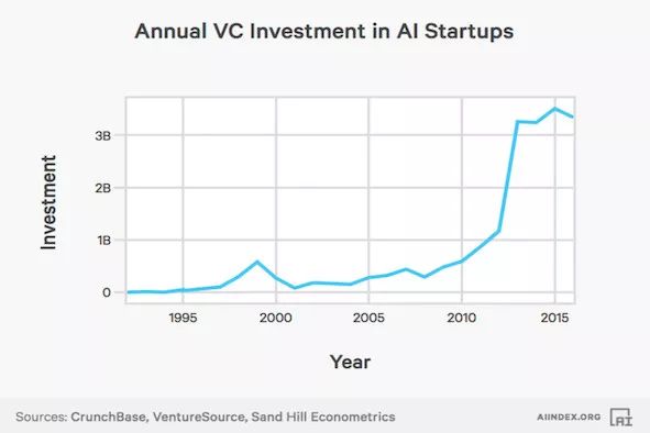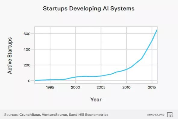 在 21 世纪之前,AI 公司几乎没有。但是从 2000 年之后则迅速出现很多AI公司,尤其是在 2006 年之后,致力于发展 AI 系统的美国初创公司数量开始呈指数增长,2016 年的 AI 公司数量是 2000 年的 14 倍之多。