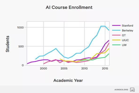 而招收学习AI的学生数在90年代经历了一次涨幅之后跌落到了冰点。从 1996 年的冰点开始招生人数只是缓慢增长,但是在2006年后招生人数也出现了迅猛增长,2017年的人数是1996年的 11 倍之多。(注:17 年下降是由于学校管理的问题)