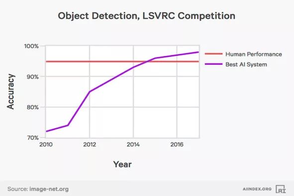 在 2016 年 ImageNet 自动标注的误差率从 2010 年的 28.5% 降到低于 3%,而人类的误差则是 5%。