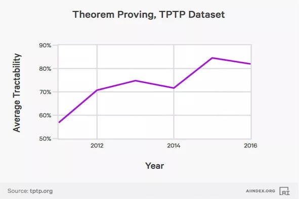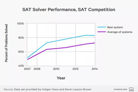 在工业应用问题上 SAT(学术能力测验)solver 解决问题的比率,从2009年已经能够做好及格水平,但是近十年也并没有较大的提升。