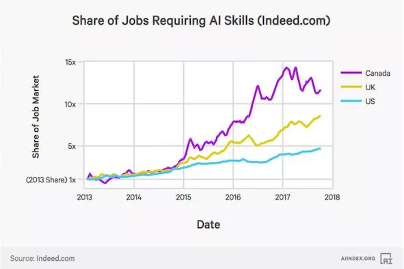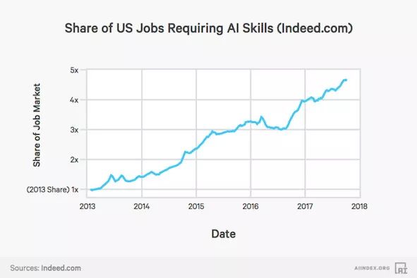数据从2013年开始,我们可以看到在美国从 2013 年到现在要求有 AI 技能的工作增长了 4.5 倍。