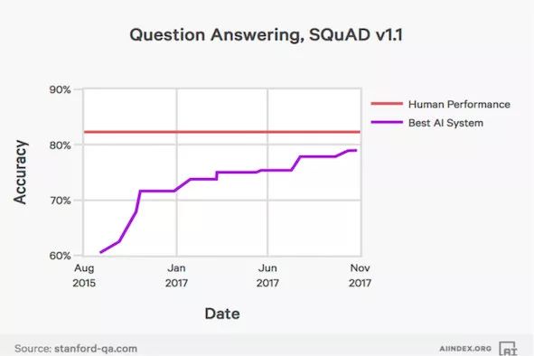 AI 系统在从文件中给问题找答案任务中的表现也像翻译系统一样,在2015年有一次大的提升,但是随后则较为缓慢。