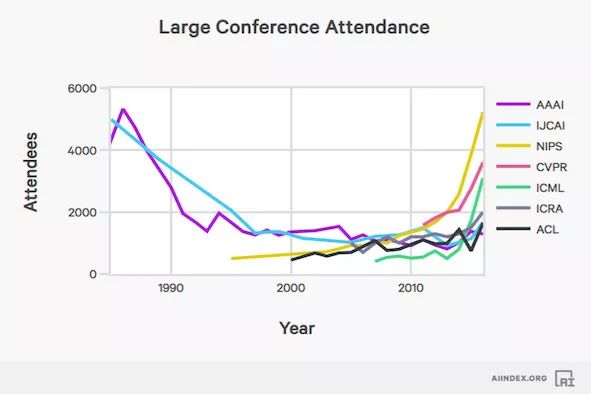 AI Index 从三个方面考量人工智能研究的发展:论文数量、高校招生情况以及AI会议参会人数的变化。