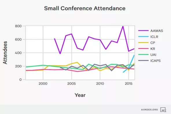 以上是在2016 年参会人数超过一千人的大会。这种整体「碗底形」的数据表也说明人们的注意力逐渐由符号推理转向了机器学习和深度学习,真所谓「三十年河东,三十年河西」。我们也知道今年的NIPS会议的参会人数高达8000多人。
