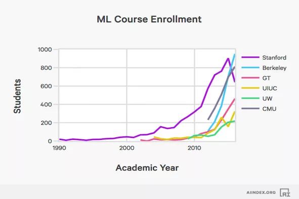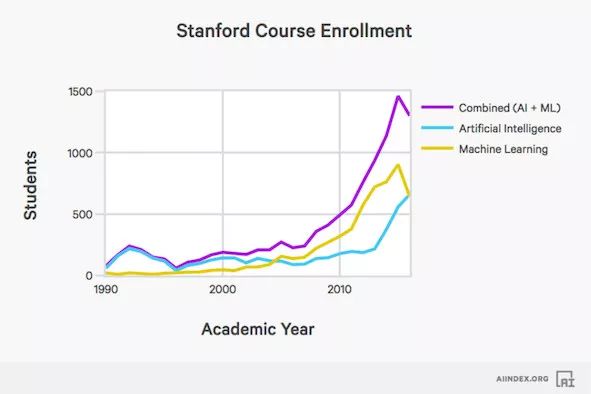 斯坦福大学从1990年开始招收 ML、AI 的学生,我们看到ML的招生人数在2000年前一直都非常少,单丝从2006年之后则开始迅速增长。