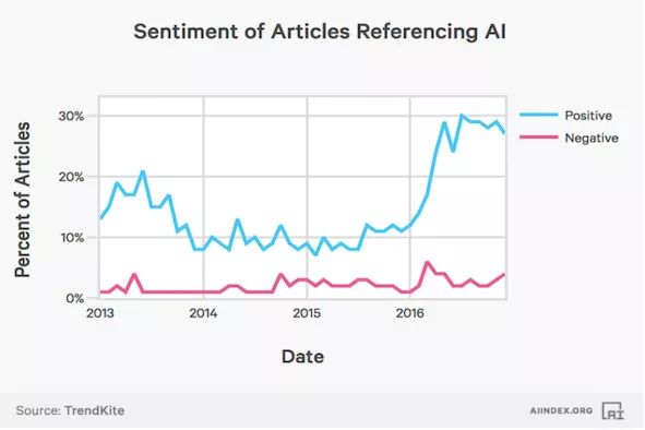 包含「Artificial Intelligence」词项的媒体文章数量:积极和消极。可以看出积极占大部分,尤其是进入 2017 年以后。