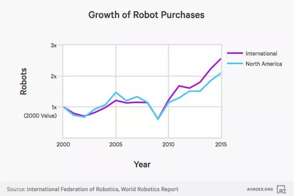 北美和全球范围内,工业机器人增长倍数。可以看出从 2009 年之后,工业机器人货运数量急剧增长。