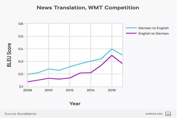 AI 系统在英-德之间新闻翻译任务中的表现在2015年之后有一次大的提升。注意之所以会出现下降,是因为翻译系统在不同的任务中会有不同的表现能力。