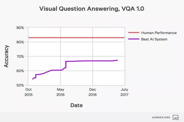 对一个图片问题的开放式回答任务中 AI 系统的表现。嗯,离人类表现差的还远。