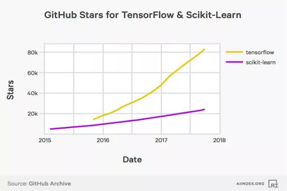 Github 上 tensorflowh(深度学习软件包)和 Scikit-learn(机器学习软件包)的 star 数(相当于喜欢或者收藏),深度学习的关注度似乎远多于机器学习的关注度。