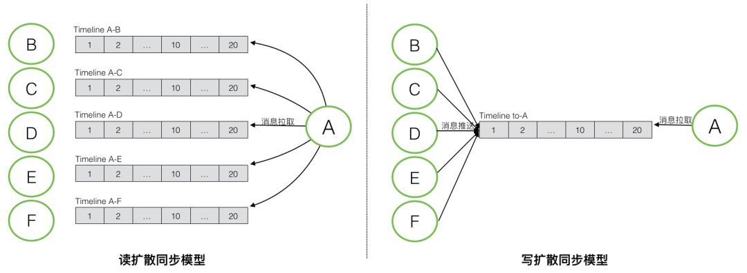 如图是读扩散和写扩散两种不同同步模式下对应的不同的 Timeline 模型,按图中的示例,A作为消息接收者,其与B/C/D/E/F发生了会话,每个会话中的新的消息都需要同步到A的某个端,看下读扩散和写扩散两种模式下消息如何做同步。