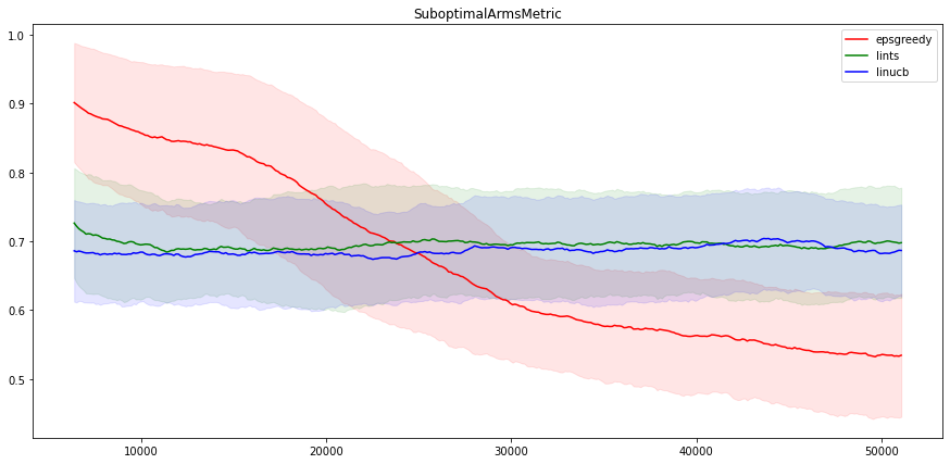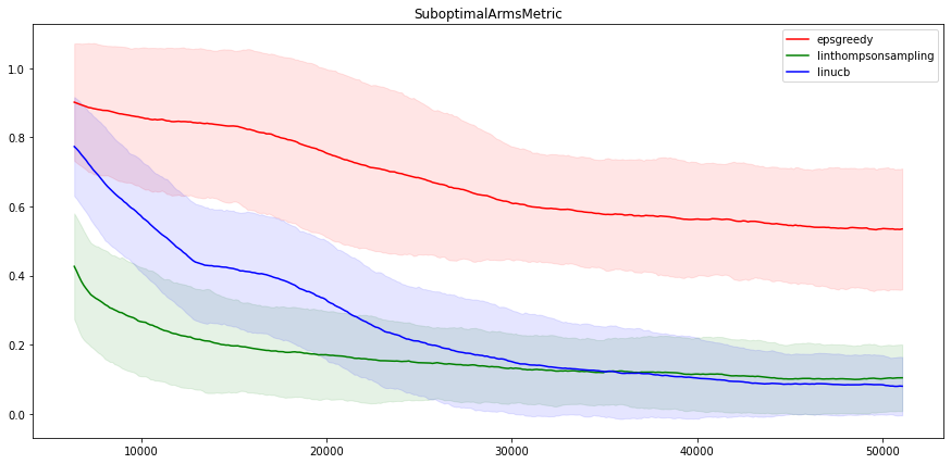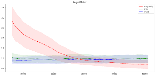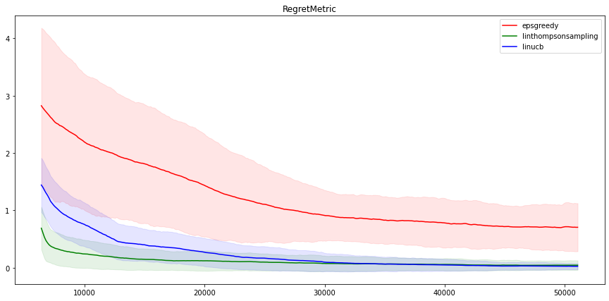 至于两个线性算法之间的差异,LinUCB 在开始时似乎有点不太顺利,但从长远来看,它要稍稍优于 LinTS(差距并不明显)。