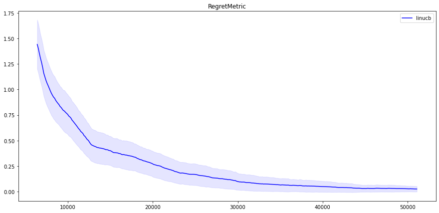简而言之,LinUCB 算法会跟踪所有操作的运行平均奖励,以及估计值周围的置信区间。在每一轮中,该算法都会选择对其奖励估计值具有最高置信度上限的操作。