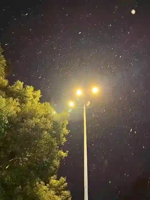 作品说明:作品摄于雪夜,夜晚中飘散的雪花,给人以寒意,但三点路灯又给人以温暖与温馨,交相呼应。