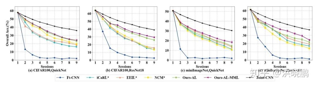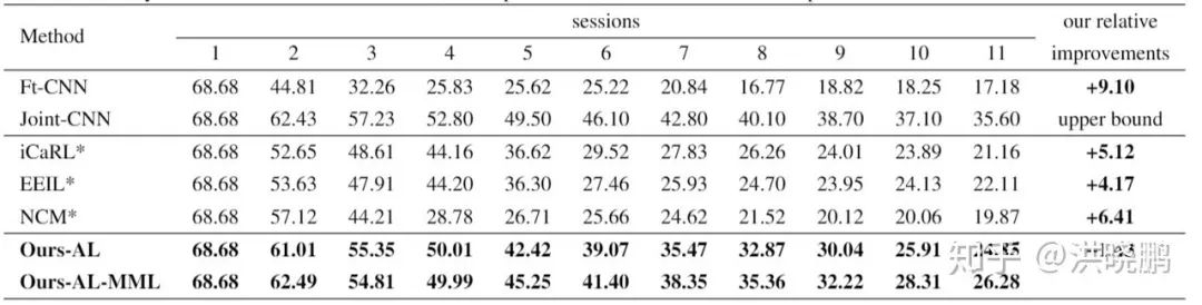 我们在CIFAR100,miniImageNet和 CUB200数据库上进行了全面的测试。部分实验结果如下图表所示,可以看出在实验中所提方法最接近理论性能上界(即将所有任务阶段训练样本混合进行批量学习),这充分证明了在小样本增量学习环境下所提方法的性能优势。另外,我们还进行不同损失函数项的对比实验,对NG网络节点和随机取样本方式进行了对比,评估了训练样本数目影响。