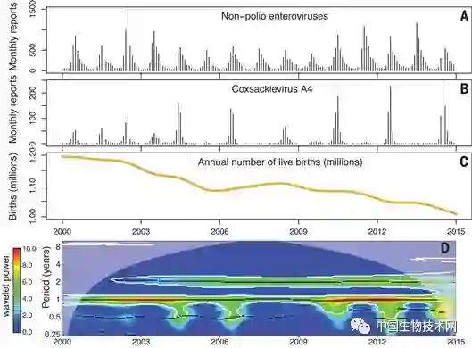 科学家观察到,肠道病毒CV-A4在2000年到2004年呈现1年周期,既2004年后开始转为2年一周期。“我们假设CV-A4表现为高度免疫感染,这种时间模式可以通过日本在过去二十年中普遍下降的出生率来解释。因为在这种情况下,只有分娩才能补充易感人群,从而确定暴发发生的可能性。”Margarita Pons-Salort博士解释说。