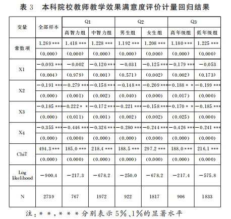 就智力分组(Q1)的回归结果看,高智力组,也就是“985”和“211”本科院校教师使用新技术手段对教学效果满意度评价的影响并不显著,而中智力组,也就是一般本科院校教师使用新技术手段对教学效果满意度评价的影响显著,这说明在授课对象不同智力水平下,新技术手段对教学效果的影响是存在差异的。