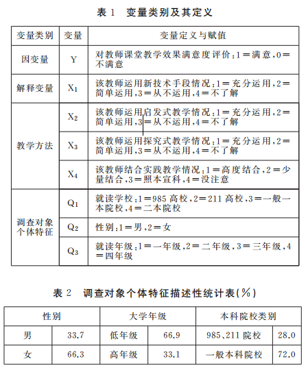 因此,在调查中,我们放弃了对学生考试成绩和创新能力的考察,而使用学生对教师课堂教学效果满意度评价作为教学效果的替代变量进行考察,这相对要科学一些。因为,一般来说,学生对教师教学效果的满意度越高,其教学效果越好。为研究需要,经过数据处理,使其(Y)满足二元变量的条件,选非常满意、满意的赋值为 1,其他为不满意,赋值为0。其变量定义和赋值设计参见表1。