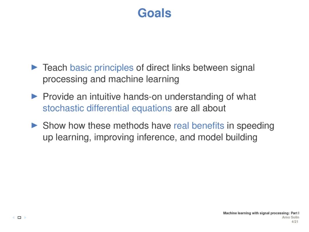 本教程旨在涵盖与离散时间和连续时间信号处理方法相联系的机器学习方面。重点介绍了随机微分方程(SDEs)、状态空间模型和高斯过程模型的递推估计(贝叶斯滤波和平滑)。目标是介绍基本原则之间的直接联系信号处理和机器学习, (2) 提供一个直观的实践理解随机微分方程都是关于什么, (3) 展示了这些方法在加速学习的真正好处,提高推理,模型建立,演示和实际应用例子。这将展示ML如何利用现有理论来改进和加速研究,并为从事这些方法交叉工作的ICML社区成员提供统一的概述。