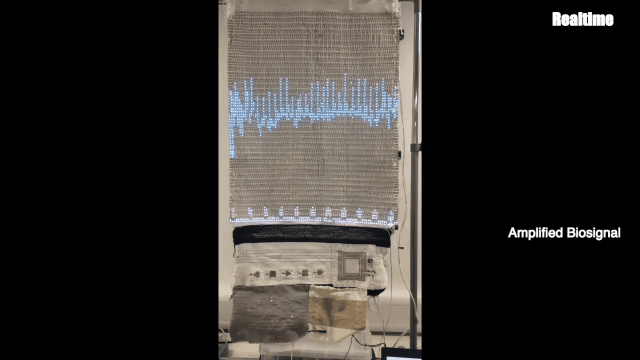 图|智能纺织显示屏实时监测心跳并显示心电图(动图素材来源:Nature Communications)