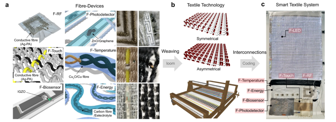 图|a)F-devices内嵌的六大关键部件;b)直接使用车间的机械纺织技术织造该系统;c)原型智能纺织系统(来源:该论文)
