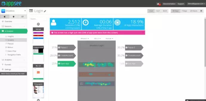 Appsee是一个独特的平台,它不仅为你提供传统的、定量的分析,还提供定性分析,同时通过触摸热图和用户会话记录提供给用户视觉上的数据。这是对数值数据的附加层,有助于回答数字背后的“为什么”。