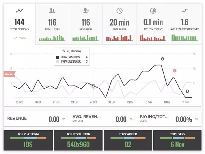 Flurry Analytics为企业提供分析,可以跨多个移动应用程序来监视的用户行为。你可以从多个应用程序中查看数据,以获得一个整体的性能视图,并很容易地比较你的iOS和Android版本。