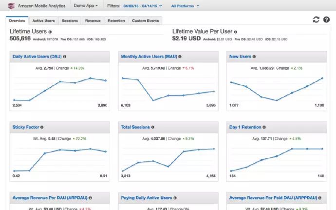 AWS允许你衡量应用程序的使用收入。你还可以跟踪关键趋势、用户保留信息和应用程序内的行为事件。通过亚马逊的精确定位,你可以使用程序分析来开展有针对性的活动,以驱动用户的参与。