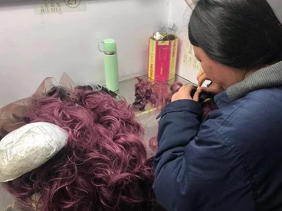 全手织的头套需要工人一针一线钩到人造头皮上,一个针眼钩2到3根头发不等,整个头套需要钩至少2万3千针,“就像个艺术品,”彭松说。