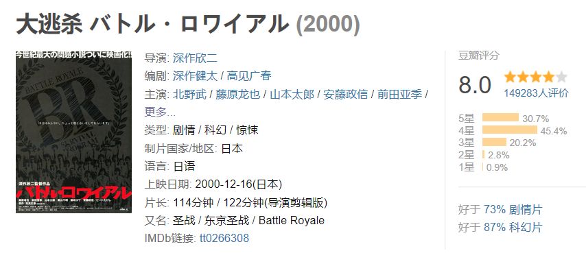 “大逃杀”模式的来源是一部同名日本电影——《大逃杀》,这部2000年发布,由北野武主演的电影,讲述了一个反乌托邦的故事。在未来,日本政府为了培养出青少年坚韧尚武的意志而出台法案,要求每年从全国学校随机抽出一个班级的同学,前往荒岛进行生存极限挑战——老师发给学生地图、粮食和各式武器,令他们自相残杀,直到存活下来的最后一个,才能离开荒岛。