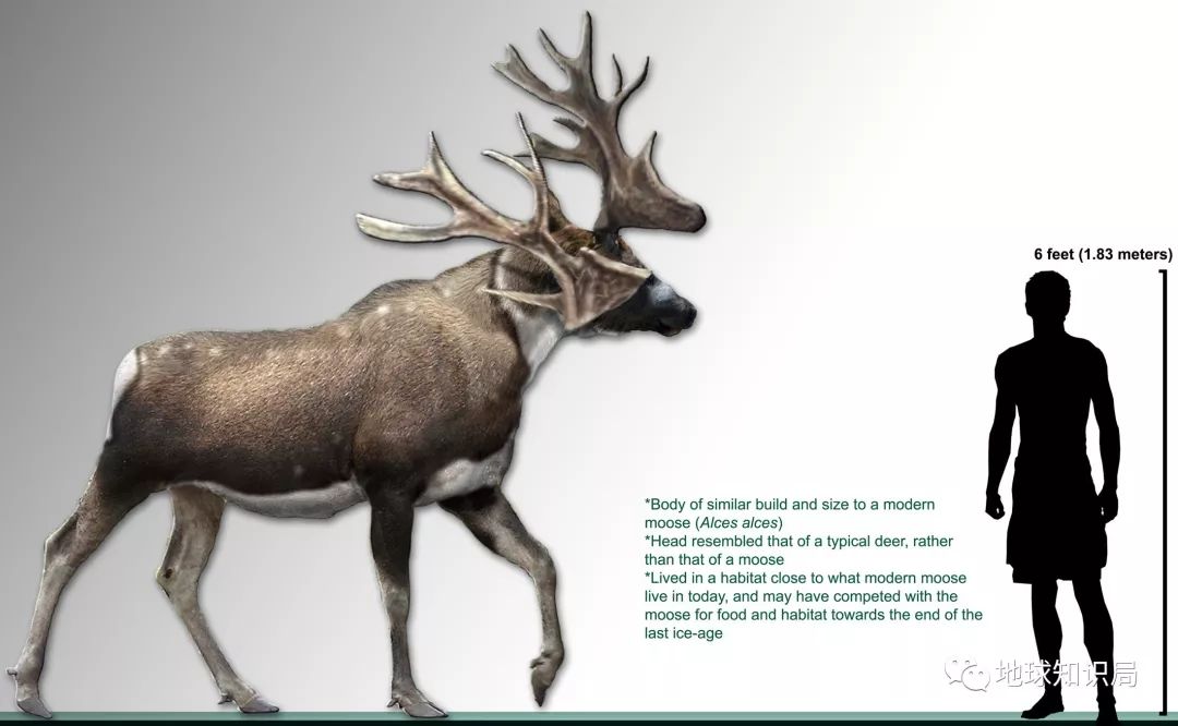 驼鹿是今天地球上最大的鹿,北美洲的大个体驼鹿高度超过2米,体长3米,体重700公斤。在史前的北美洲还生活着另一种驼鹿,它就是罕角驼鹿。
