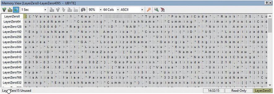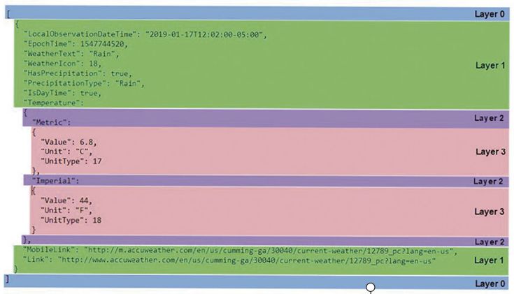 感兴趣的信息通常向下嵌套几层,必须系统地解析和提取。在图2的示例中,从第0层开始,然后进入第1层的“温度”对象, 接着进入第2层的“英制单位”对象,最后获得华氏温度的“值”为 44。