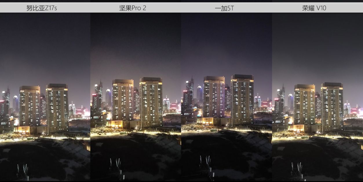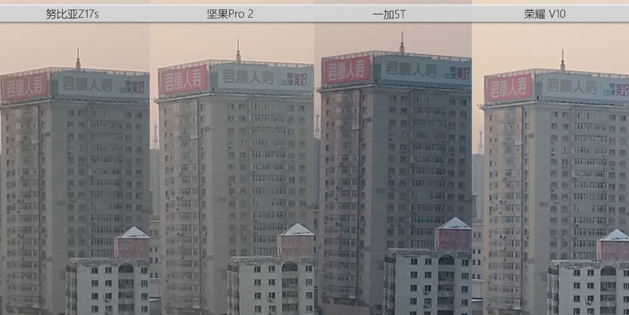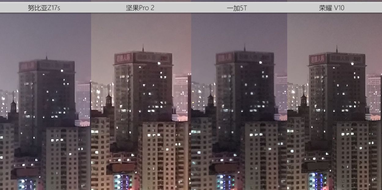 反转来了,夜景方面,V10几乎没有对手,无论是纯净度、亮度还是细节都挑不出毛病。Z17s的饱和度偏低,画面比较素,没有坚果Pro 2的通透,涂抹的痕迹也重一些,一加5T各项都不占优势。