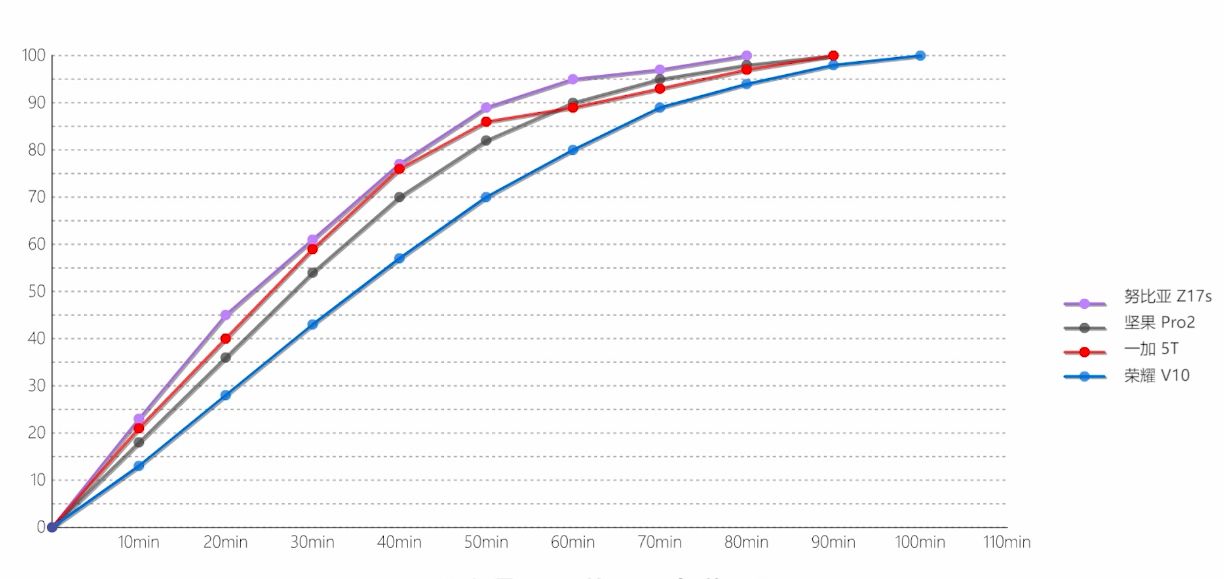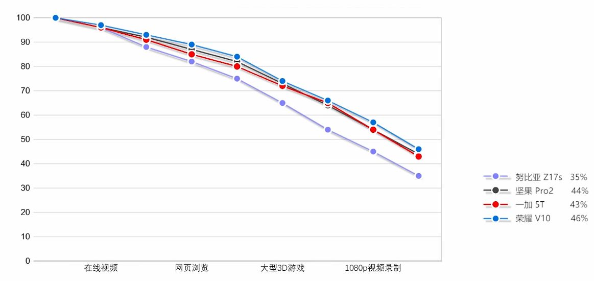 剩余40%的一加5T比Z17s稍好,电池容量的提升还是最直接的办法,配合DASH闪充,一定程度淡化续航的影响。V10和坚果Pro 2不用多说,稳稳的抢到头牌。