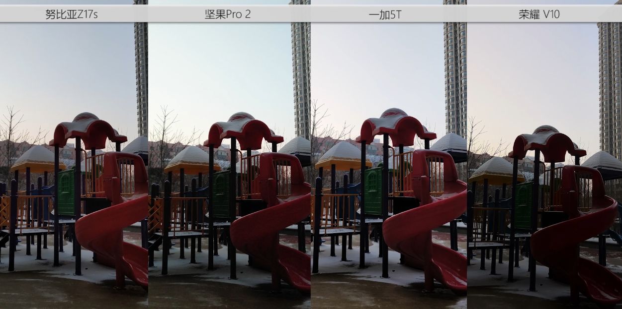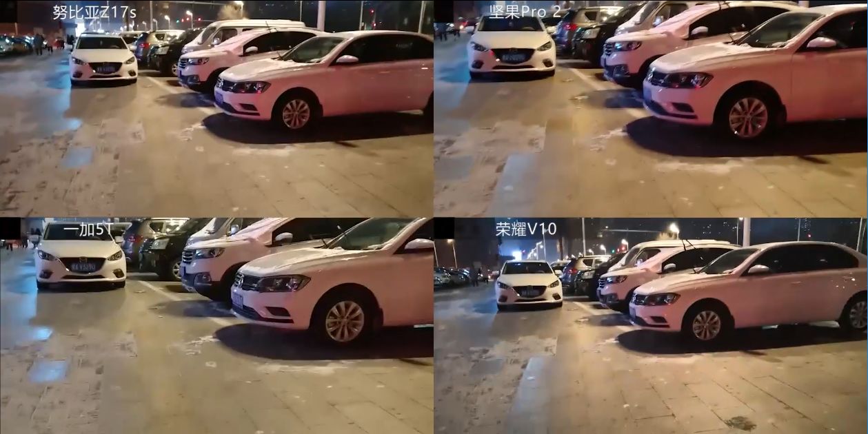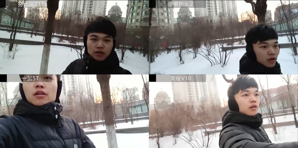 在白天的情况,努比亚在拍摄雪地的时候曝光和白平衡都不正常,其他三台机器看起来好很多。稳定性的测试,由于努比亚和荣耀V10都没有电子防抖,画面一动起来都是颤颤悠悠的。坚果Pro2和一加5T的电子防抖能够抵消大部分的抖动,实际效果比较平滑稳定。但是画面裁切比较明显。