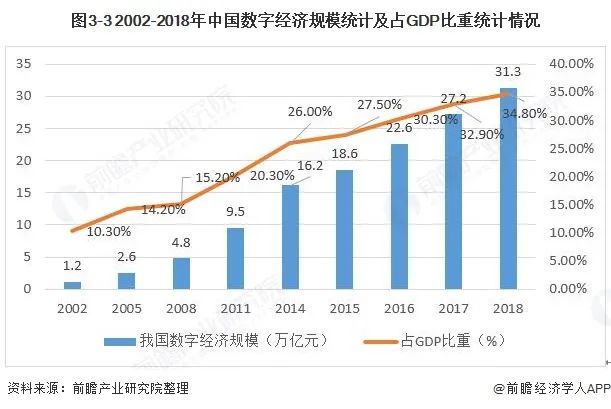 我国的数字经济飞速发展,2017年我国数字经济规模达27.2万亿元,同比增长20.3%,占GDP的比重达到32.9%。截止至2018年我国数字经济规模达到31.3万亿元,按可比口径计算,名义增长20.9%,占GDP比重为34.8%,占比同比提升1.9个百分点。其中数字产业化规模达6.4万亿元,信息消费、数字经济领域投资、数字贸易等需求活力不断释放。