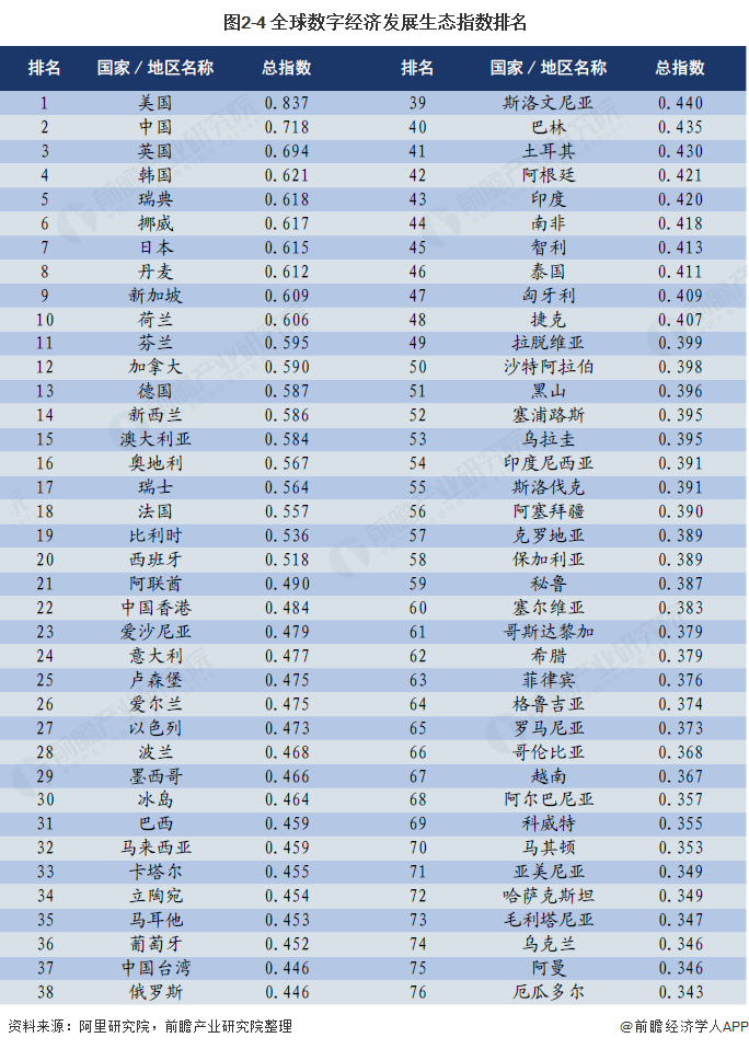 数字经济是基于新一代信息技术,孕育全新的商业模式和经济活动,并对传统经济进行渗透补充和转型升级,根据《2018年全球数字经济发展指数》报告,其中,全球数字经济发展指数排名中国以0.718的指数成绩位列全球第二,数字经济发展程度较高。