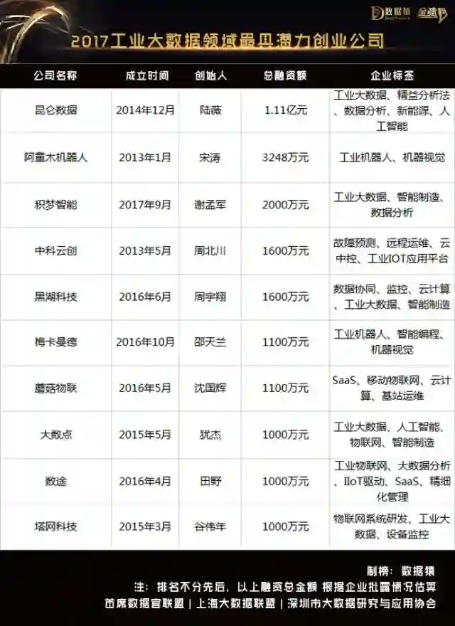 基于此,数据猿通过对成立于2012年之后,在资本市场上获得高度认可,业务发展迅速、业界口碑良好,且为非被收购企业、非上市公司的所有独立创业公司近1年的关注,并与上海大数据联盟、首席数据官联盟、深圳大数据产业协会四方的共同探讨与研究,评选出以下10家在2017年表现优异的中国工业大数据领域最具潜力的创业公司供业内参考。