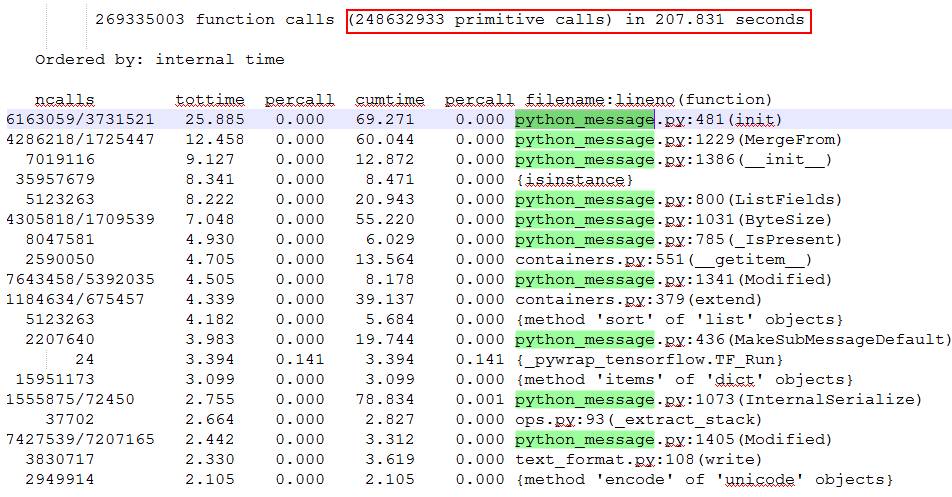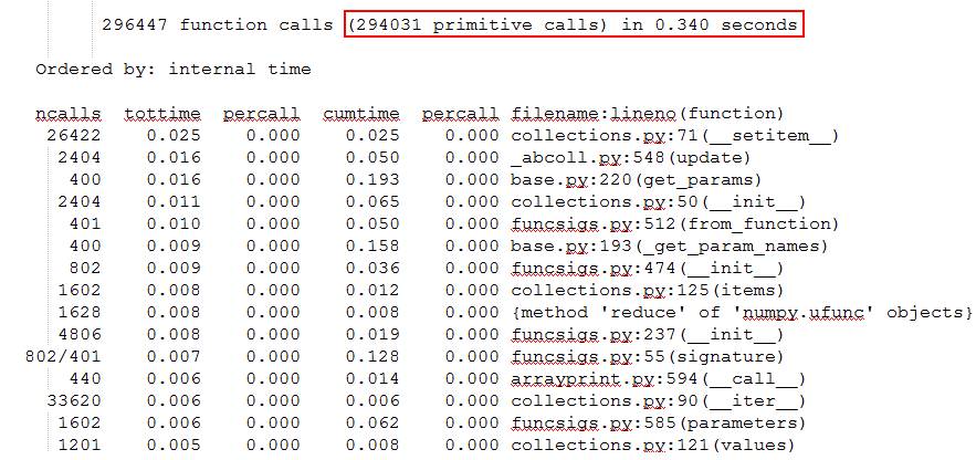写完代码测试时,发现了个巨坑的问题:TenforFlow内部的序列化操作非常频繁、性能十分差。构造了110个测试样本,scikit-learn耗时只有0.340秒,29万次函数调用;而TensorFlow耗时达207.831秒,有2.48亿次函数调用。