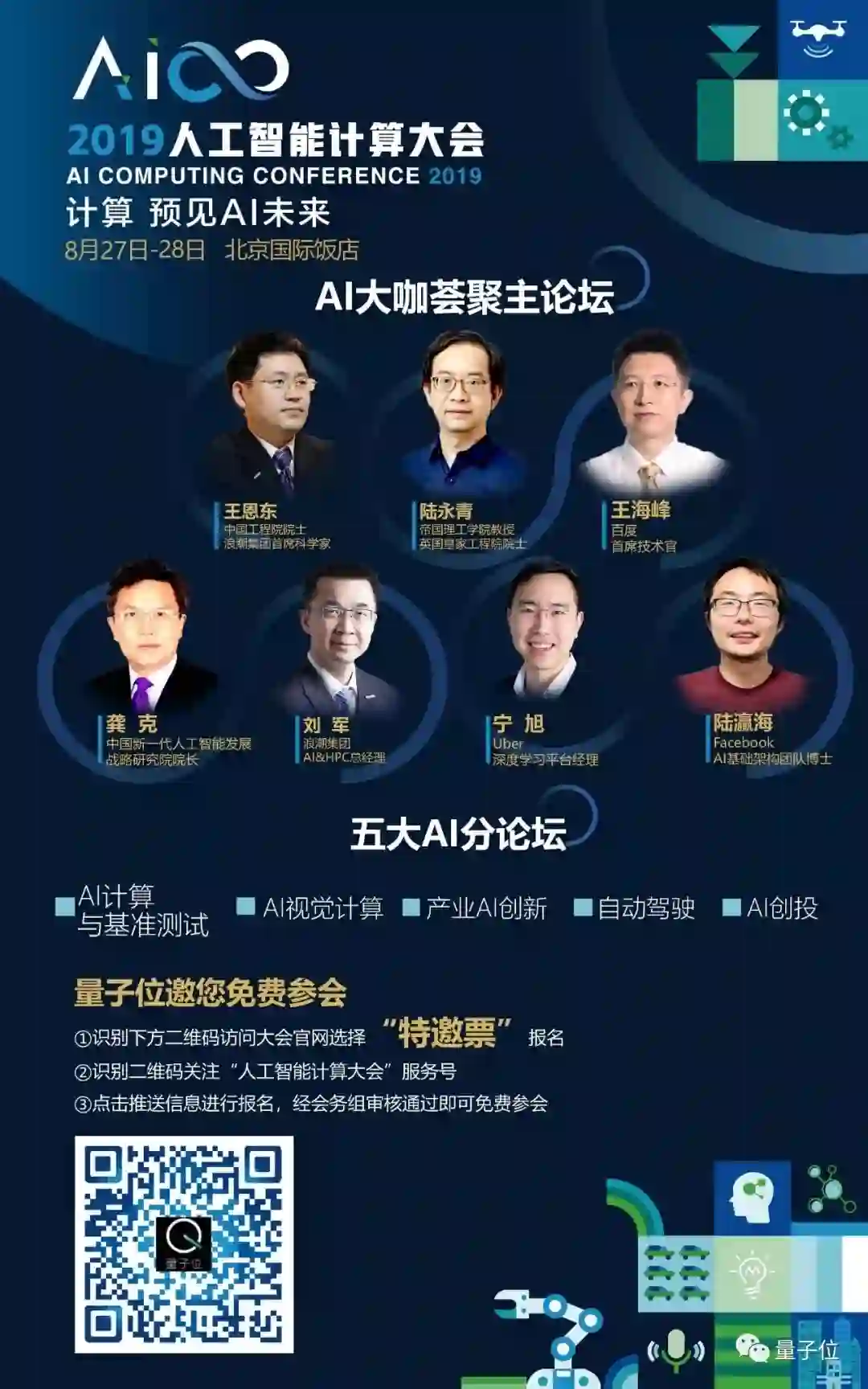 2019人工智能计算大会将于8月27日-28日在北京举办,通过量子位特邀渠道,即可获得原票价1099限时免费报名通道。识别下图二维码即可报名。