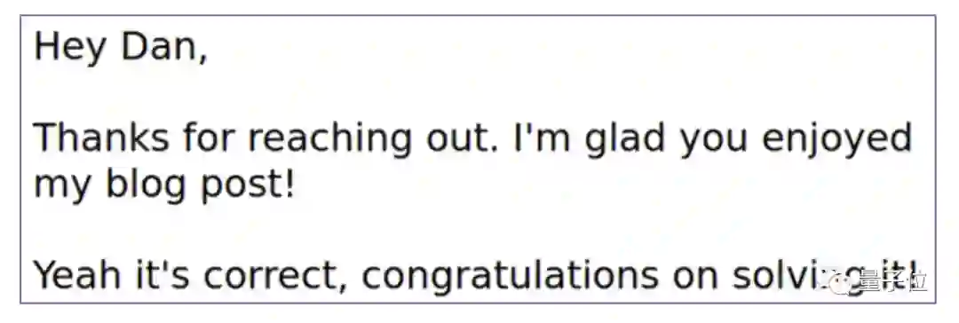而后Dan联系上了这位研究员,在邮件的回复中,也证实了Dan的结果是正确的: