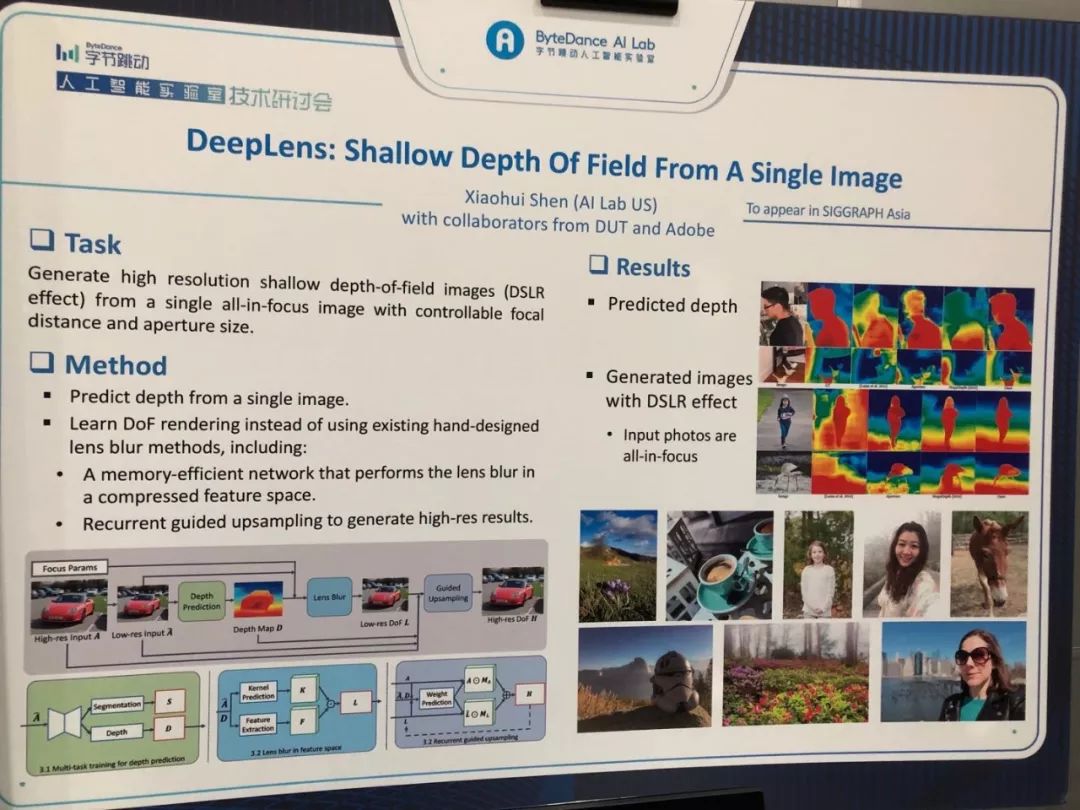 其实预测深度图有点类似于图像分割任务,只不过这种逐像素的分类问题预测的是所有像素离镜头的距离。具体而言如上图绿色的 Depth Prediction 模块所示,模型不仅会使用全连接网络直接预测深度,同时还会使用额外的前景分割任务获得更准确的分割边界线。字节跳动 AI 实验室在现场展示了这一方法的实际效果,虽然不能说完美,但一般人是看不出问题的。