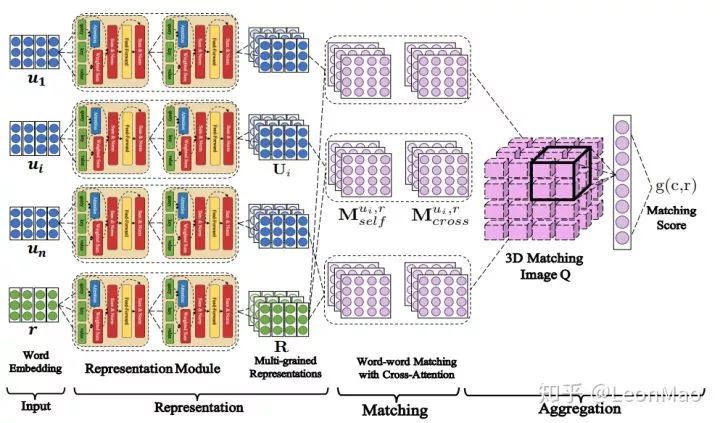 就相对复杂点,先将三种表示分别输入cross-attention层,从而得到另外三种不同的表示,再用这新的表示分别做匹配。所以在结构图中可以看到,每个utterance和response匹配后,总共得到六种匹配矩阵~