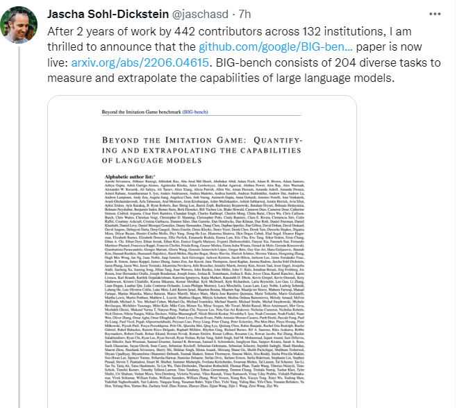 数量的海量增加通常会给系统注入新行为。在科学领域,规模的扩大往往需要或使新颖的描述成为可能,甚至开创新的领域(Anderson, 1972)。随着语言模型规模的增加,它们同样展示了定性的新行为(Zhang et al., 2020e)。例如,他们表现出了编写计算机代码的初级能力(Hendrycks et al., 2021a; Chen et al., 2021; Austin et al., 2021; Schuster et al., 2021b; Biderman & Raff, 2022),诊断医疗条件(Rasmy et al,2021),以及语言之间的翻译(Sutskever et al,2014),尽管目前他们在所有这些事情上的能力都不如拥有有限领域知识的人类。这些突破能力(Ganguli et al,2022年)已经通过经验观察到,但我们无法可靠地预测新突破发生的规模。我们可能还没有意识到已经发生的其他突破,但还没有在实验中被注意到。语言模型在变大的过程中发生的量变和质变具有潜在的变革性(Bommasani et al., 2021; Black et al., 2022)。大型语言模型可以增强或取代人类,使其能够完成一系列广泛的任务,这些任务可以用文本响应来构建。它们可能启用全新的应用程序。如果没有适当的介入,他们可能还会将不受欢迎的社会偏见深深嵌入技术堆栈和决策过程中——但如果有适当的介入,他们可能会使决策自动化,减少人为偏见。由于语言模型潜在的变革性影响,我们了解它们的能力和限制,以及随着模型的改进,我们了解这些能力和限制可能如何变化,这是至关重要的。这种认识将直接推动新技术的发展;使我们能够识别并减轻潜在的有害社会影响,从失业到社会偏见的自动化(Bender et al,2021年);使我们能够预测模型行为可能微妙地偏离人类意图的其他方式(Kenton et al,2021年);允许我们将研究精力引向最有前途的方向(Bommasani et al,2021年,第3节);并使我们避免将研究资源投入到可能仅靠规模解决的问题上(Sutton, 2019)。