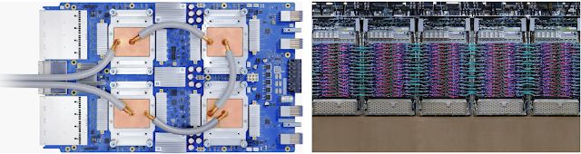单个 TPU v3 设备(左)与 TPU v3 Pod 的部分部件展示(右)。TPU v3 是谷歌最新一代的 Tensor Processing Unit(TPU)硬件。它以云 TPU v3 的形式对外出售,采用液体冷却技术以获得最佳性能(计算机芯片 + 液体 = 太有意思了!),而完整的 TPU v3 Pod 将可以为全球最大的 ML 任务提供高达 100 petaflops 的计算能力。