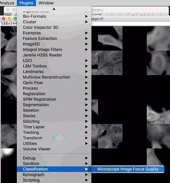 在 Fiji(图像 J)里面,一个 TensorFlow 模型对显微镜细胞拼接图像的聚焦质量进行了评估。边界的色调表示预测的焦点质量,边界亮度表示预测的不确定性。