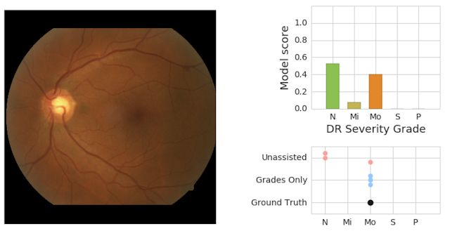 左侧是一张视网膜眼底图像,被眼科专家评审小组评定为中度 DR(「MO」)。右上角是模型预测得分的图示(「N」=无 DR,「MI」=轻度 DR,「MO」=中度 DR)。右下角是医生在没有帮助的情况下给出的一组分数。