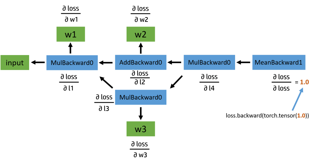 下面给出了对应的代码,我们定义了input,w1,w2,w3 这三个变量,其中 input 不需要求导结果。根据 PyTorch 默认的求导规则,对于 l1 来说,因为有一个输入需要求导(也就是 w1 需要),所以它自己默认也需要求导,即 requires_grad=True(如果对这个规则不熟悉,欢迎参考 我上一篇博文的第一部分 或者直接查看 官方 Tutorial 相关部分)。在整张计算图中,只有 input 一个变量是 requires_grad=False 的。正向传播过程的具体代码如下: